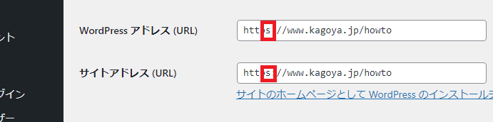 次にホームページ側で行う設定についてですが、WordPressで作られたサイトだった場合であれば、「設定」→「一般」内にあるアドレスの項目でhttpをhttpsに変えて更新を行う必要があります。