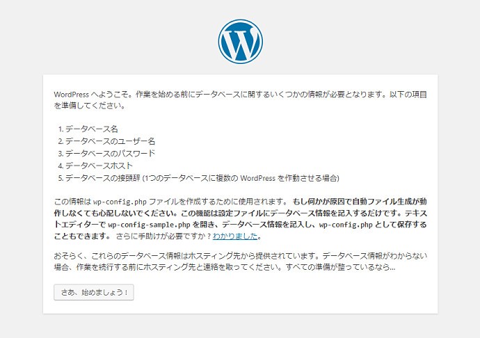 WordPressをアップロードしたURLへアクセスすると、インストール用の専用画面が以下のように表示されるので、画面の指示に従ってインストールをすすめます。