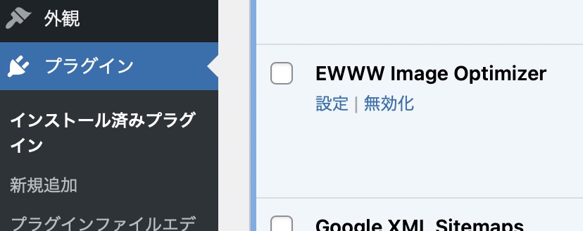 有効化が完了しましたら、このプラグインの初期設定を行うために管理画面の「プラグイン」から「EWWWW Image Optimizer」の設定に進みます。