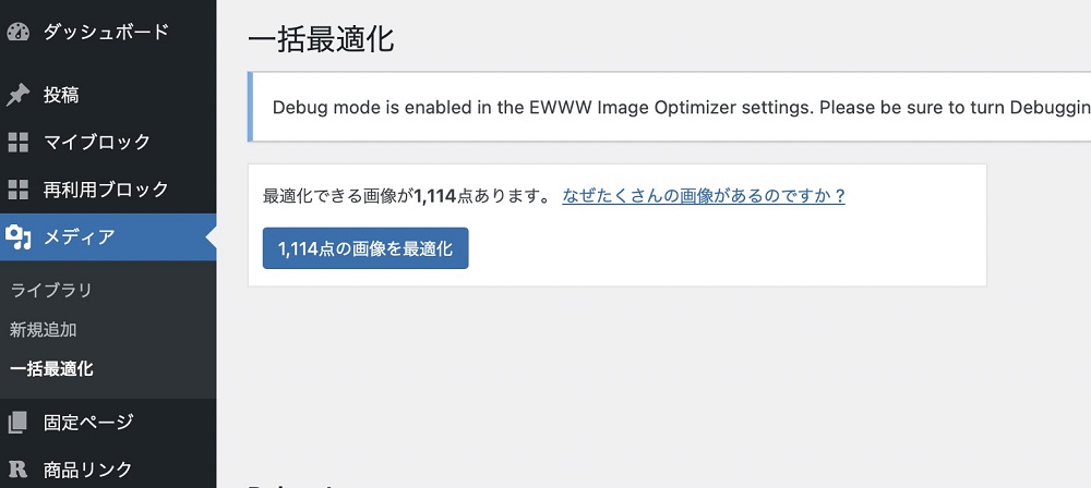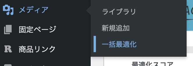 既存画像の圧縮に関しては非常に簡単で、前述でご紹介のEWWWW Image Optimizerの初期設定を終えている状態であれば、管理画面の「メディア」に以下の画像の様な「一括最適化」が選べるようになります。