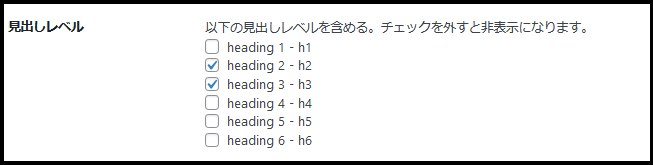 また、目次に含めるHタグをH2だけやH3までなど最大H6まで目次で表示させるかどうかの設定も可能です。