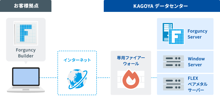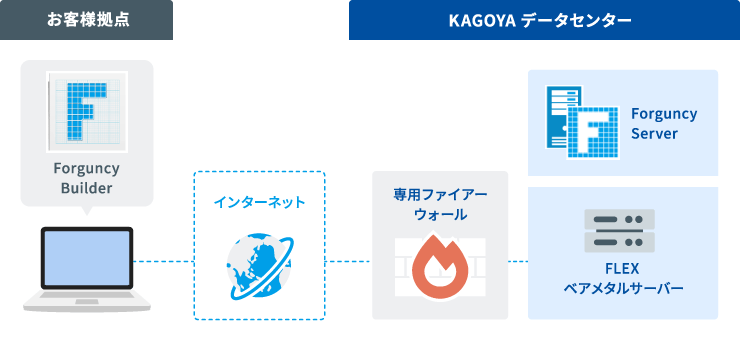 KAGOYA のForguncyプランでは、ForguncyBuilder で作成されたWebアプリをクラウド上で運用できる環境をライセンス費用込みのパッケージでご提供。サーバーやネットワーク等の機器の運用保守は、24時間365日専任技術者がサーバー監視の KAGOYA にお任せいただき、ハイパフォーマンスかつ高稼働率を誇る安定した環境で Forguncy を利用できます。