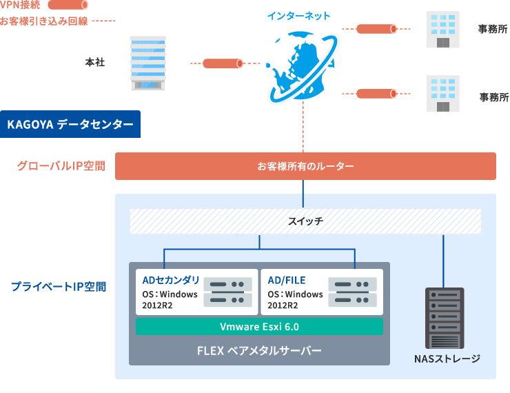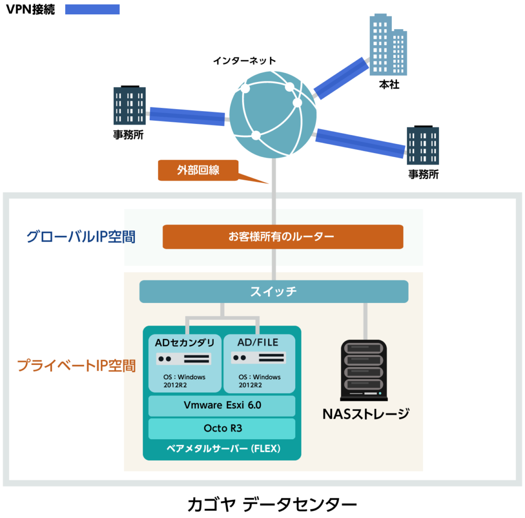 現状のサーバー環境をそのまま移行するため、お客様のルーターをお預かりしてVPN接続環境とした上で、VMwareでプライベートクラウド環境を用意し、スムーズな移行を実現。ファイルサーバーにはNASを利用し、複数拠点から今まで通りオンプレミス感覚でファイル共有いただける環境を構築いたしました。