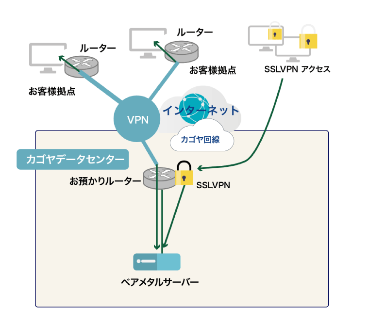 社内ネットワークでご利用されているVPN回線とルーターを持ち込んでいただくことで、追加の1拠点としてサーバーの利用が可能になります。 社外からのリモートアクセスも対応可能です。