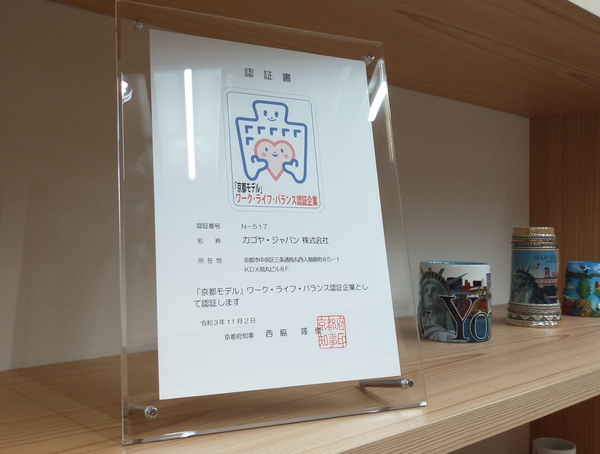 カゴヤ・ジャパン株式会社は、2021年11月、ワーク・ライフ・バランス推進のための取組みを推進し、制度取得実績が出るなど複数の認証基準を満たした企業として、京都府より「京都モデル」ワーク・ライフ・バランス認証を受け、認証企業となりました。
