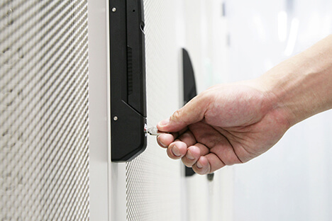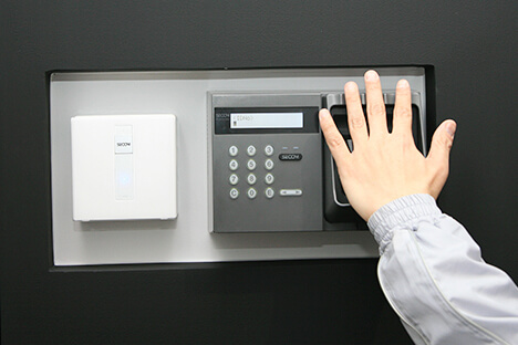 サーバールームへの入退室には、ICカードに加えて暗証番号の入力、手のひらの静脈認証を行っています。