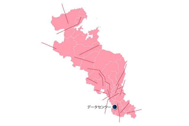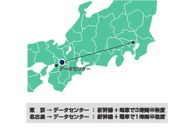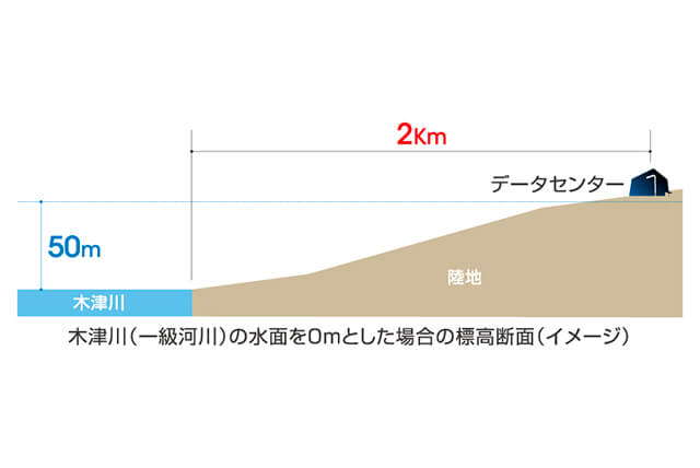 データセンターは、付近の1級河川から直線で2㎞離れ川面から50mの高台にあるため、津波・洪水の心配はありません。また、地中配線の地域のため台風による電柱の倒壊や断線の心配もありません。