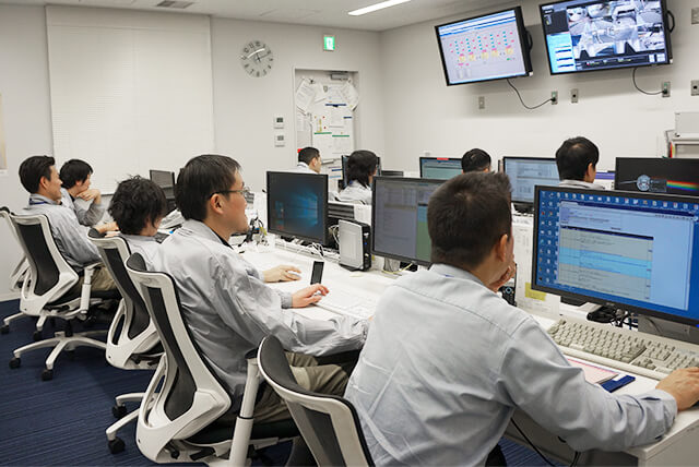 24時間365日監視入退室管理、対人認証、ICカード認証、生体認証、監視カメラ、機器管理フロアの施錠などの設備と、専任技術者による24時間365日有人監視体制です。