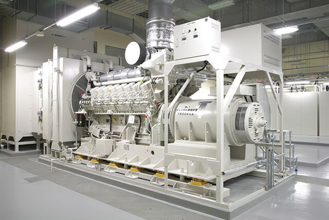 非常用発電機を完備特別高圧2系統受電(本線・予備線方式)。受電からサーバー供給まで別系統の提供が可能です。無停電電源装置(UPS)はN+1構成、非常用発電機(48時間無給油運転)を完備しています。