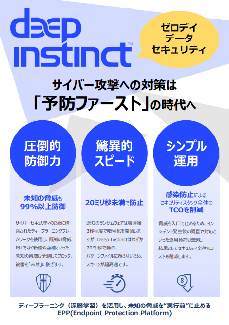 「Deep Instinct(ディープインスティンクト)」は世界で初めてディープラーニング(深層学習)技術を活用し、未知の脅威に対しても「予防ファースト」を実現できるエンドポイントセキュリティのソリューションです。従来のセキュリティソフトでは検知ができない、あるいは間に合わないゼロデイ攻撃からPCやサーバーを守ります。