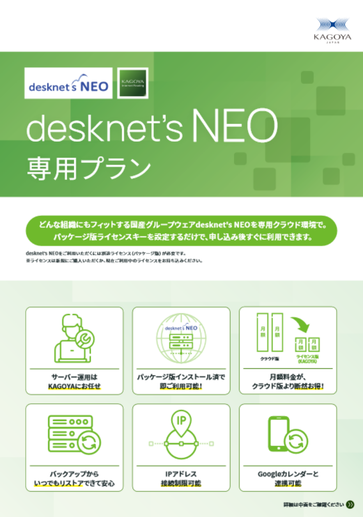 どんな組織にもフィットする国産グループウェアdesknet’s NEO を専用クラウド環境でご提供します。パッケージ版ライセンスキーを設定するだけで、申し込み後すぐに利用できます。