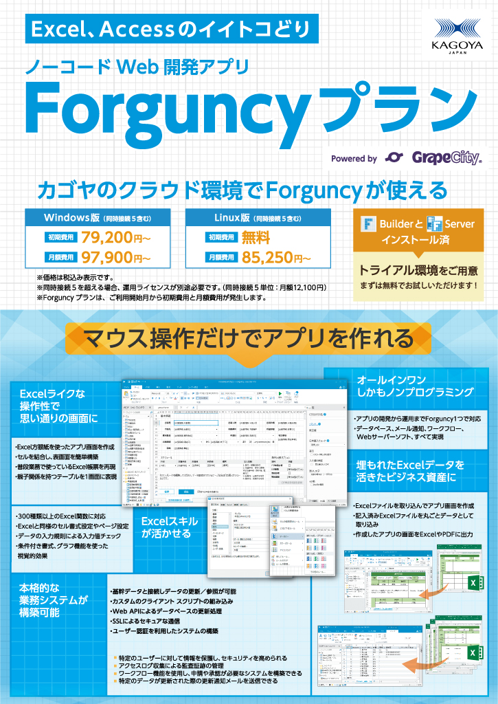 Forguncy は、Excel感覚でレイアウトができる画面デザイン機能を備えた ノーコードWeb開発&運用プラットフォームです。