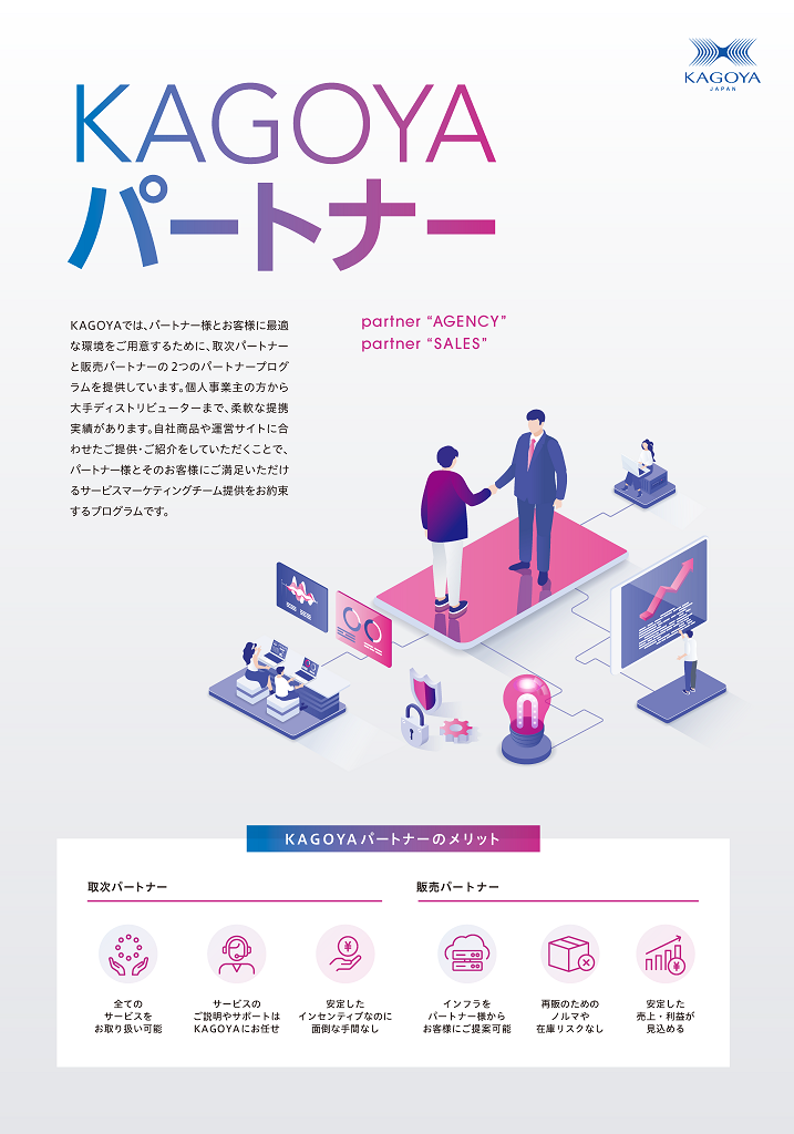 KAGOYA では、パートナー様とそのお客様に最適な環境をご用意するためのパートナープログラムを提供しています。