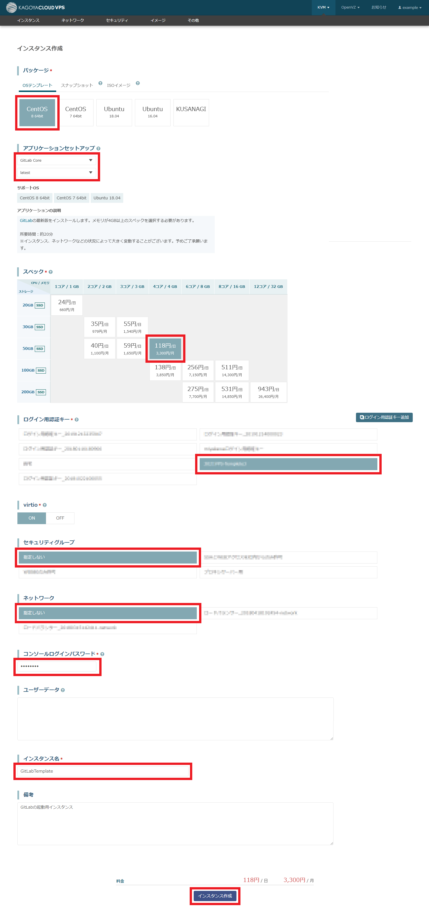 | スペック | 4コア / 4GB / 30GB | 必要なスペックを選択してください。メモリが4GB以上のスペックを選択する必要があります。 |