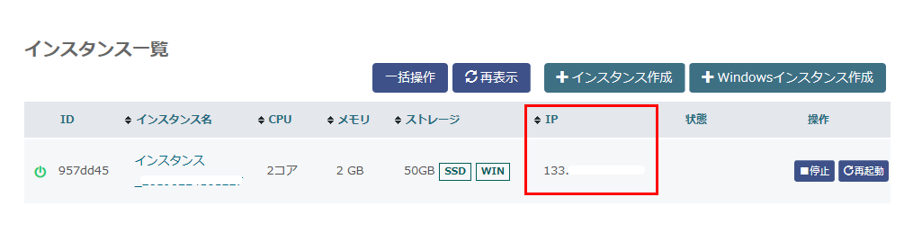 VPSの管理画面にログインし「KVM」を選択後に表示される画面で、「インスタンス一覧」の項目で確認できます。下記では赤枠内に記載があります。