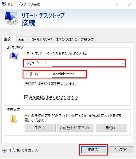- 「コンピューター」欄に(1)で調べたWindows VPSのIPアドレス、ユーザー名に「Administrator」と入力し、「接続」ボタンをクリックします