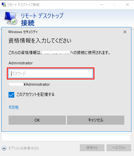 - パスワードを入力下記の赤枠欄に、「Windowsインスタンス作成」した際のログインパスワードを入力