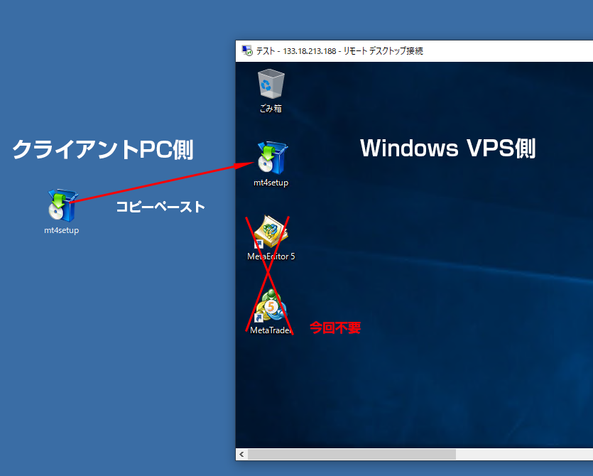 - ダウンロードしたMT4プログラムをコピーした後、Windows VPS画面上にペーストしましょう