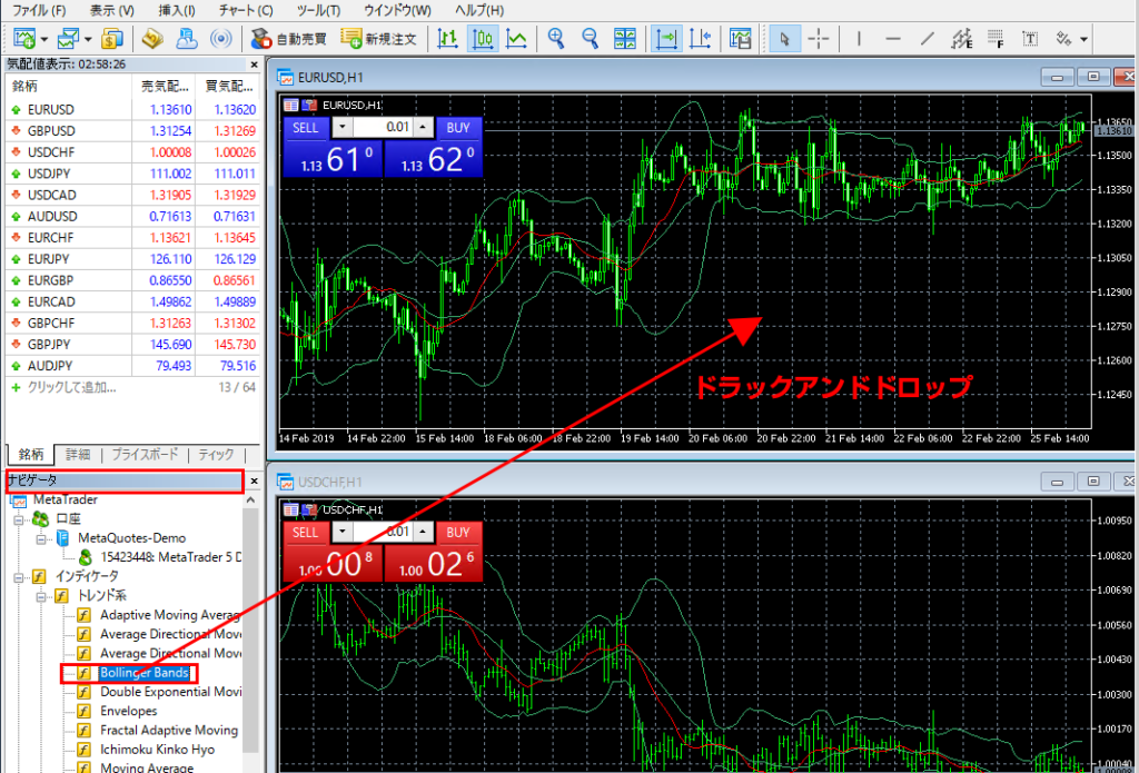 - 「Bollinger Bands」の文字の部分をクリックして、表示させたいチャートの上までドラックアンドドロップします