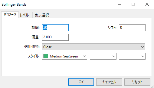- 画面左側にある「ナビゲーター」内にある「Bollinger Bands」を探します