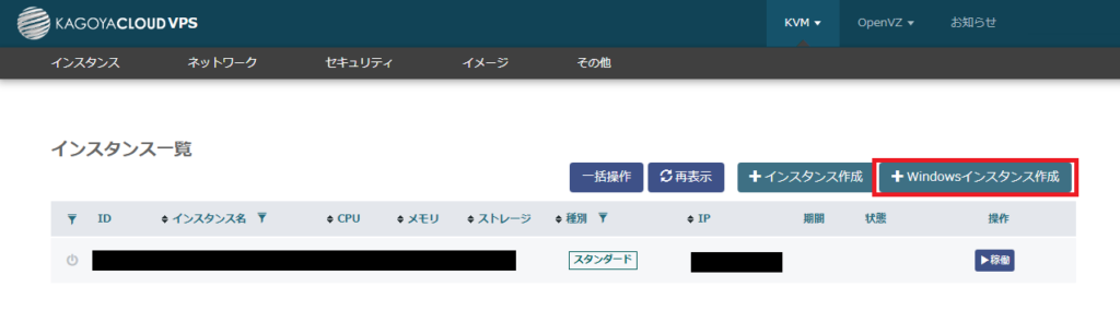 VPSの管理画面にログインし、「Windowsインスタンス作成」ボタンをクリックします。