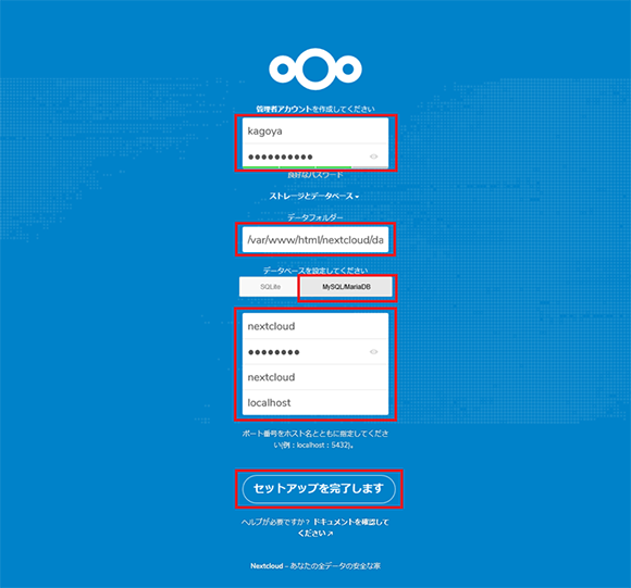 設定が完了しましたら、Nextcloud用のデータベースとユーザーを作成します。