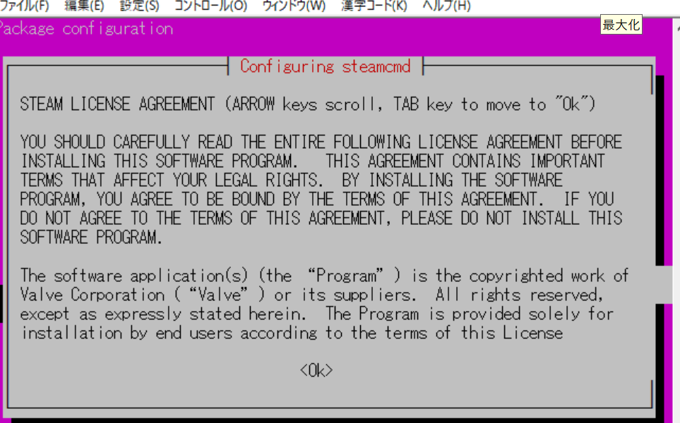 途中、上記の様なピンク背景の確認画面が表示されますので、tabキーを押して<ok>が赤く選択された状態でEnterを押します。