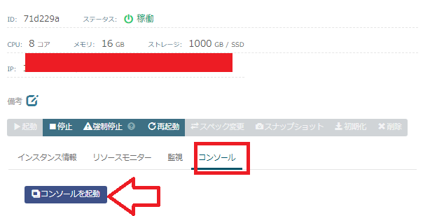 インスタンスの作成が完了しましたら、インスタンス名をクリックしてコンソールに移動します。