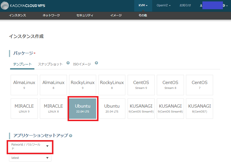 作成するインスタンスは、「パッケージ:Ubuntu22.04」「アプリケーションセットアップ:Palworld / パルワールド」を選択します。
