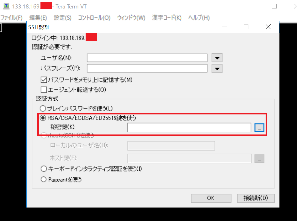 まずは、準備したリモートログオンクライアントを立ち上げ、VPSで作成したインスタンスのIPアドレスを入力して「OK」を押します。