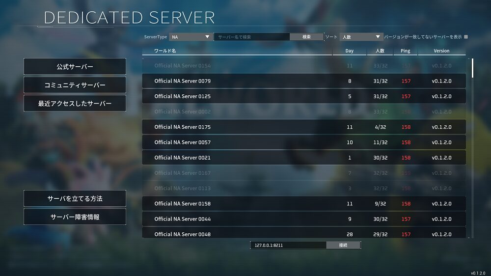 公式サーバーの一覧が表示されますので、画面下にあるIPアドレスの入力欄に移動し、VPSで作成したインスタンスのIPアドレスとその後ろにファイアーウォールで設定した「:8211」を付け加えたアドレスを入力すれば、上記で作成した自分専用のマルチサーバーに入ることができます。