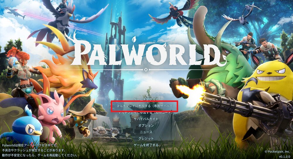 パルワールド起動後に表示される画面にて、「マルチプレイに参加する(専用サーバー)」を選択します。