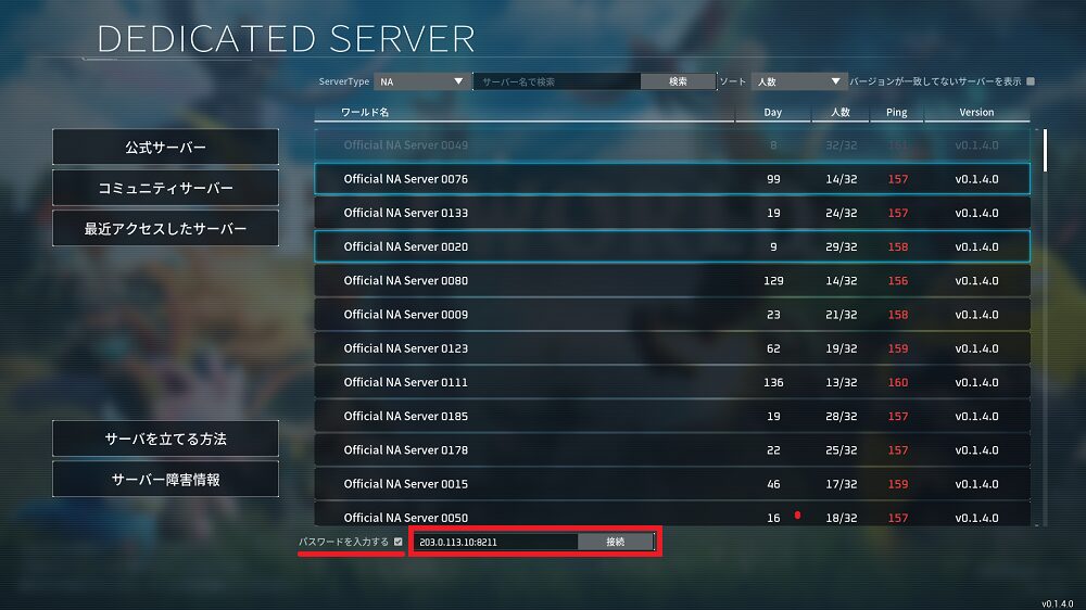 パルワールドのマルチサーバーにパスワード付きでログインできる
