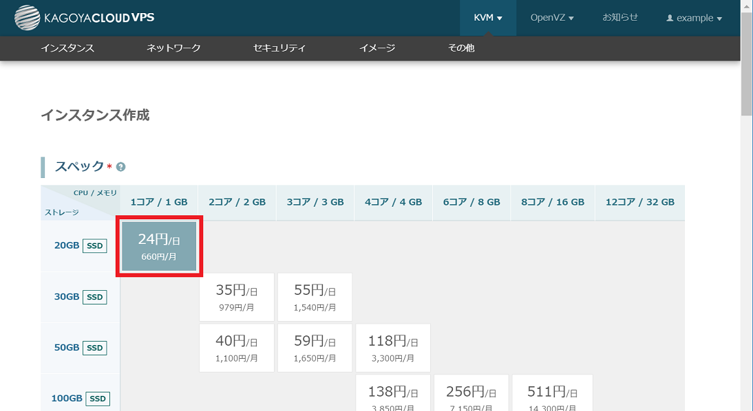 任意のスペックを選択します。 今回の例では最小スペックで十分なので、 1コア/1GB のスペックを設定しました。