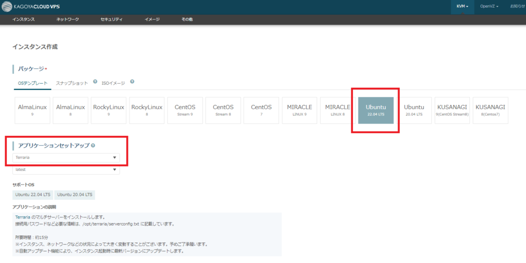 OSは「Ubuntu22.04」を、アプリケーションセットアップは「Terraria」を選択する。
