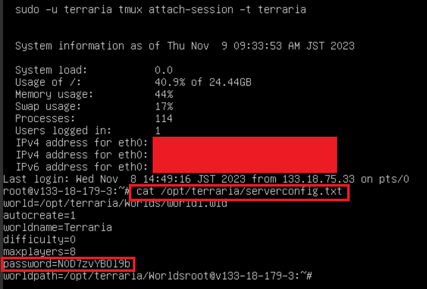 インスタンスが完成しましたら、実際にTerrariaで遊ぶ際に必要なパスワードを確認する必要があります。