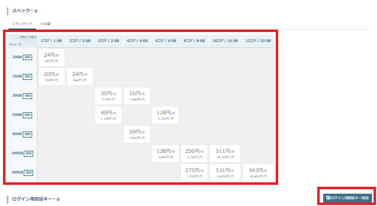 スペックはお好みのものを選択(今回は2コア/2GB、25GBを選択します)、そしてログイン用認証キーを作成したのちそれを選択します。