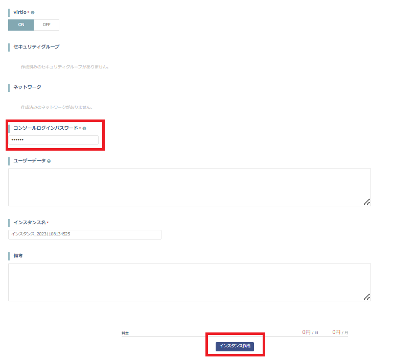 コンソールログインパスワードを設定し(後ほど使用します)、「インスタンス作成」を行います。