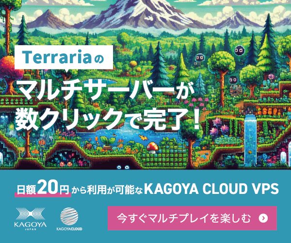 テラリアPC版で、快適にマルチプレイを楽しみたいときは、テラリア用マルチサーバーを構築します。テラリア用マルチサーバーの構築や運用にあたり、別途サーバー機などを用意する必要はありません。VPSを使えば、安価な価格でテラリア用マルチサーバーを構築・運用可能です。カゴヤのVPSであれば、日額20円~の低価格で利用できます。使った日数分だけの課金となるので、お金が無駄になりません。