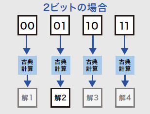 | 古典コンピュータ | 1ビットで、1または0の どちらかの値を表す ![]() | 入力の組み合わせごとに計算する為、 組み合わせの個数分計算が必要。 ![]() |