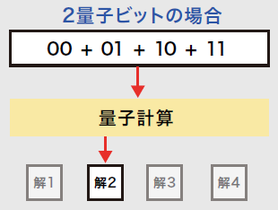 | 量子コンピュータ | 1量子ビットで1と0を 同時に表示できる ![]() | 入力の組み合わせ分を全て一括で 処理できる為、高速計算ができる。 ![]() |