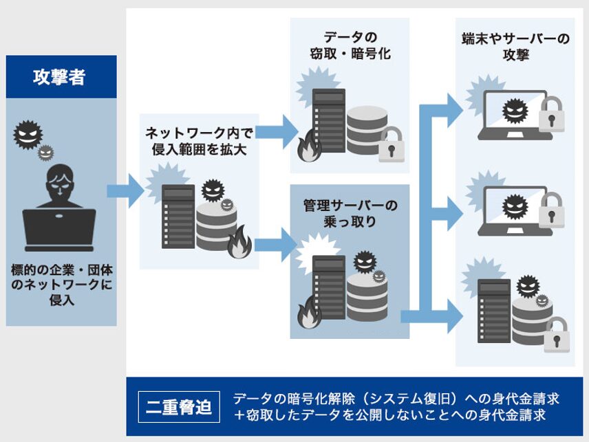 また、かつてはデータの暗号化解除に対してのみ身代金が要求されていました。一方、現在はデータを窃取し、「データを公開しない」ことに対しても身代金を請求する「二重脅迫」が横行しています。