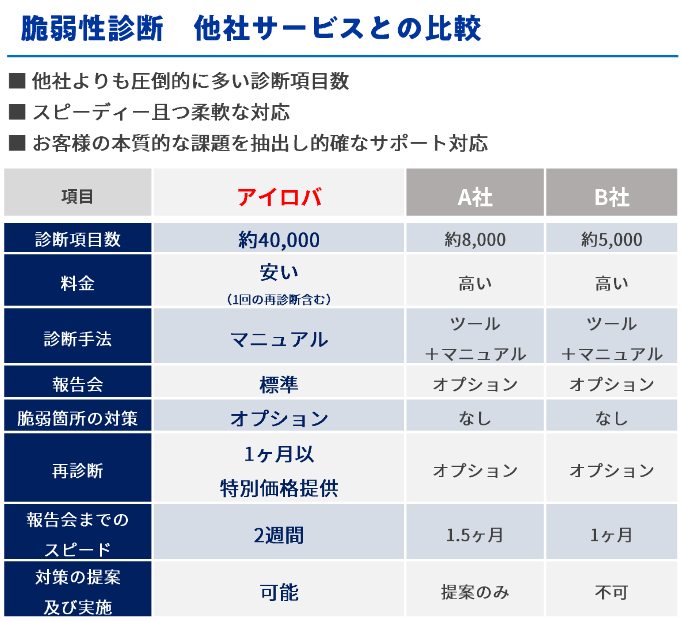 そういった事態を避けるためにも、まずは脆弱性診断によりリスクを見える化することが必要です。なかでも株式会社アイロバの脆弱性診断であれば、診断後の対策をレクチャーいただける等、アフターケアが充実しておりおすすめできます。予算に合わせた診断項目の選定や短納期でのレポート提出も可能です。