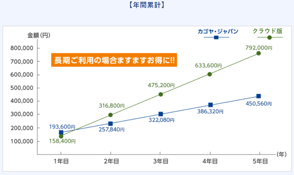 一方で「desknet’s NEOクラウド版」を使用する場合は毎月一定のコストがかかる仕様のため、長期間利用すると意外と割高となってきます。その点、カゴヤ・ジャパンのdesknet’s NEO専用サーバーではパッケージ版ライセンス購入後は、毎年少額の「サポートサービス」と「カゴヤのクラウドサーバーの利用料」だけで済むため、クラウド版と比較すると2年目以降の累計がかなり安くなります。