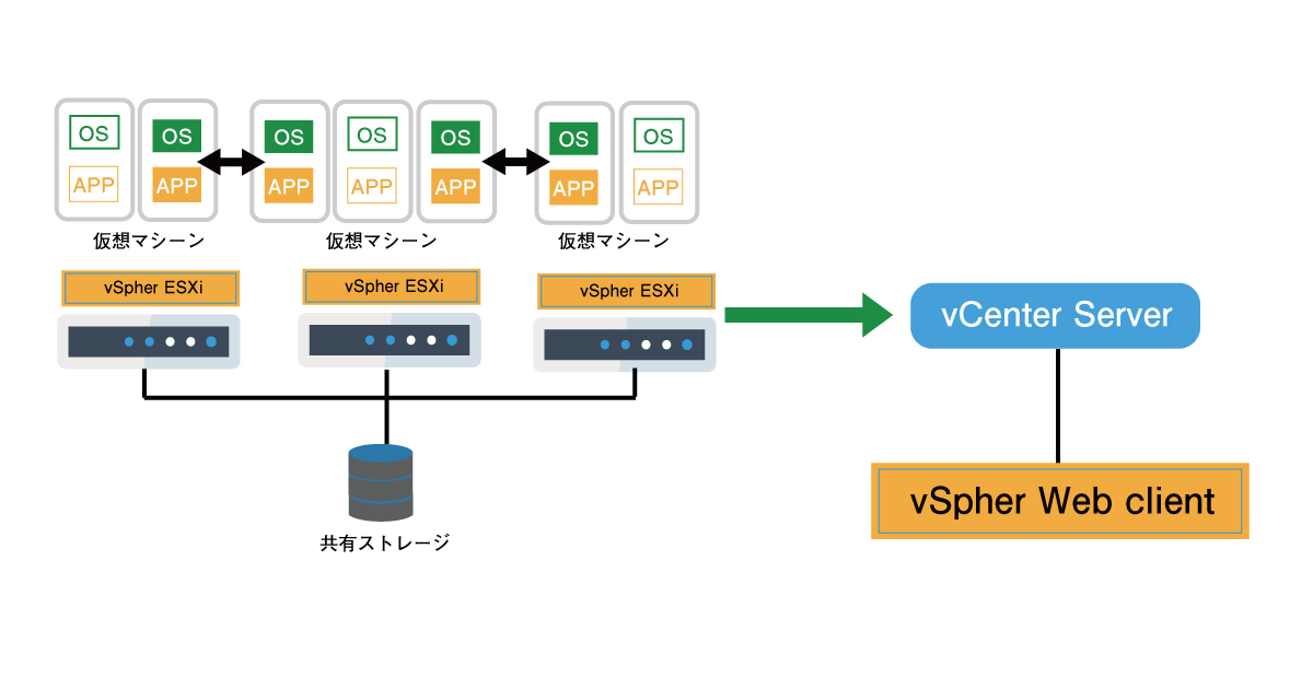 またVMware vSphereを採用する際は、共有ストレージが用いられるのが一般的です。共有ストレージ上に仮想マシンをはじめとして、コンピューターの仮想化に必要なデータが保存されます。