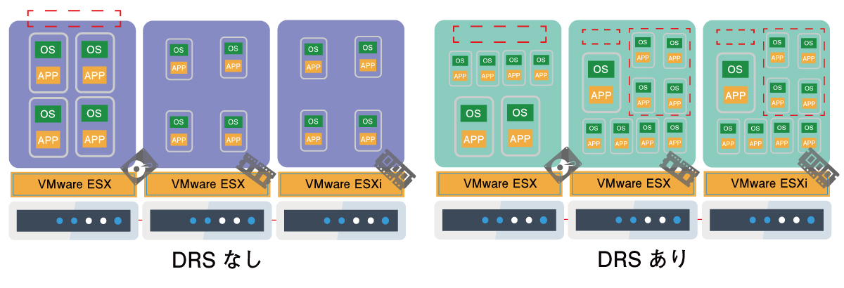 VMware DRS(Distributed Resource Scheduler)は仮想環境の負荷状況に応じて、仮想マシンの配置を適切に決定・コントロールする機能です。仮想環境の負荷状況に基づき、仮想マシンを配置したり移動したりします。VMware DRSを利用すれば、ユーザー自身で物理サーバーの負荷状況をチェックして、仮想マシンを配置する物理サーバーを決める必要がありません。
