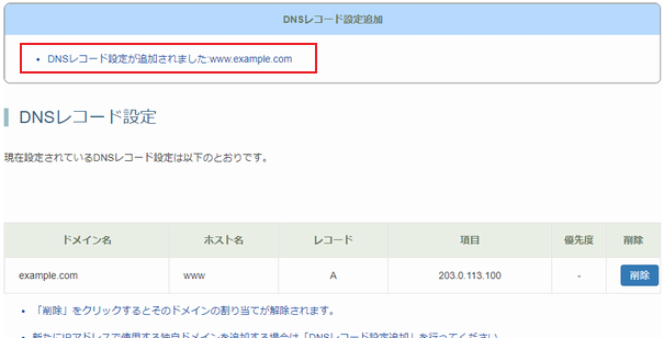 4. 「DNSレコード設定が追加されました」と表示されたら新規登録完了