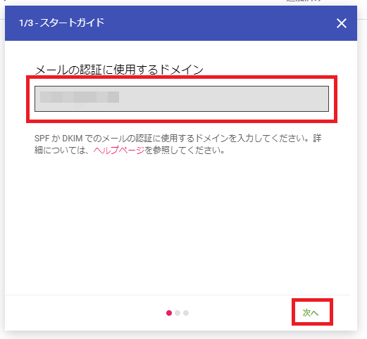 - 「メールの認証に使用するドメイン」を聞かれるので、Postmaster Toolsで統計をとるドメインを入力して「次へ」をクリックして下さい。