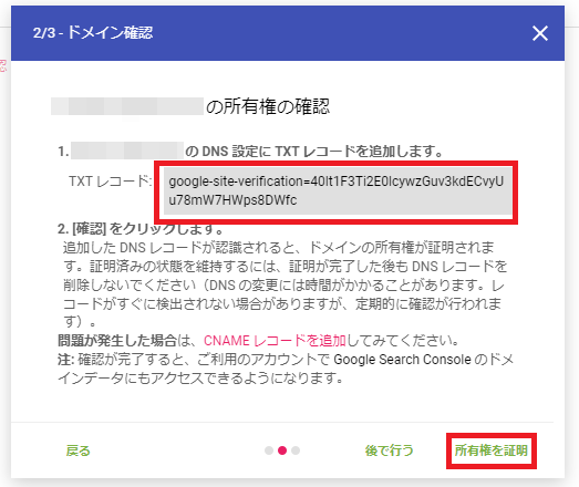 画面の指示に従い、対象ドメインのTXTレコードに記載のDNSレコードを登録して下さい。DNSレコードの登録方法は、DNSサーバーのマニュアルなどで確認しましょう。