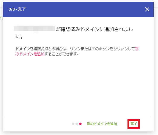 - ドメイン所有権の確認が終わったら完了画面が表示されるので「完了」をクリックして下さい。
